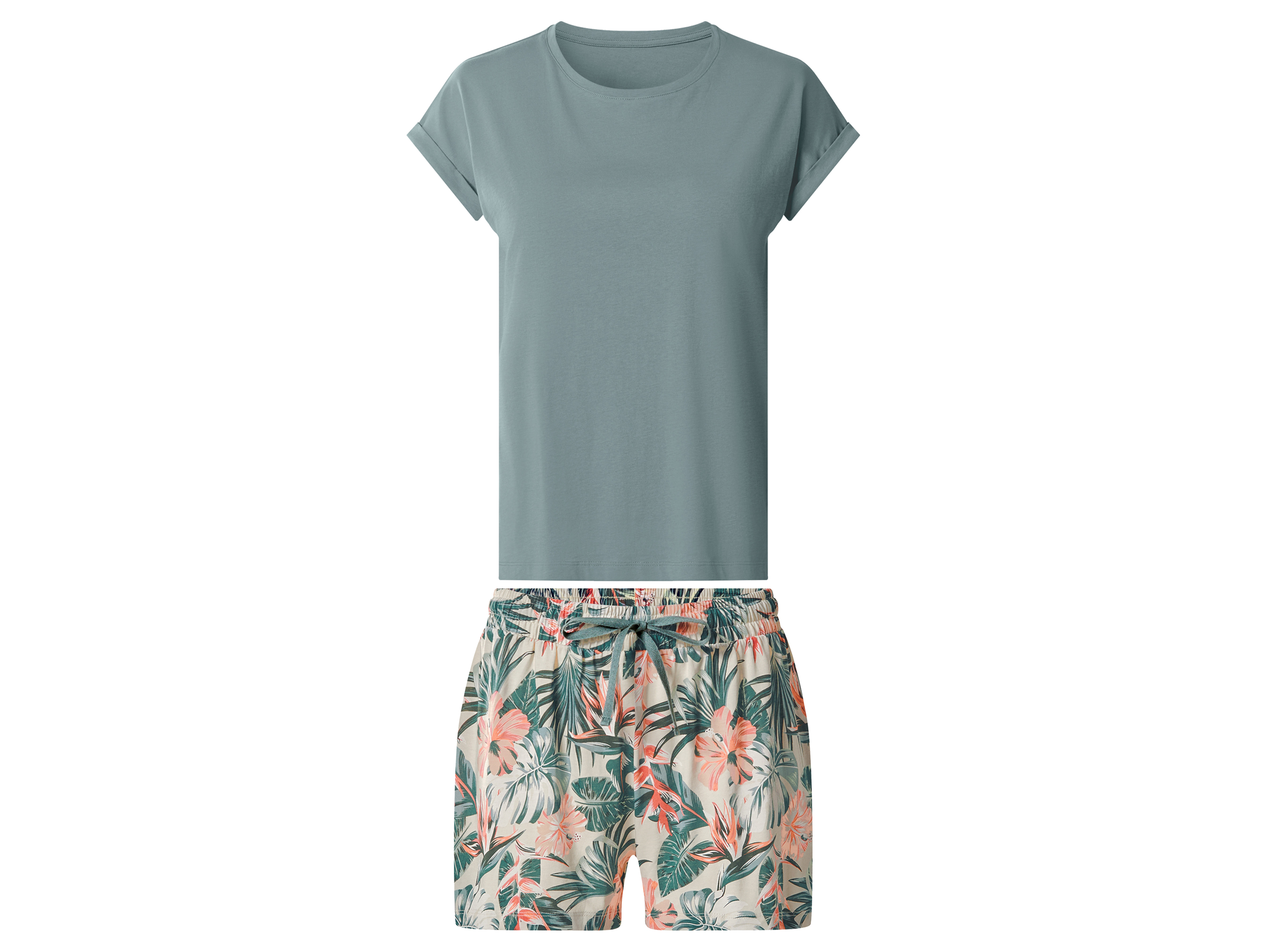 esmara ® Dámské pyžamo Vlastnosti Příjemné na nošení díky čisté bavlně Triko s rukávy v ohrnutém vzhledu a postranními rozparky Šortky s pohodlným elastickým pasem, páskem na zavazování a malými postranními rozparky Vlastnosti produktu tabletd…
