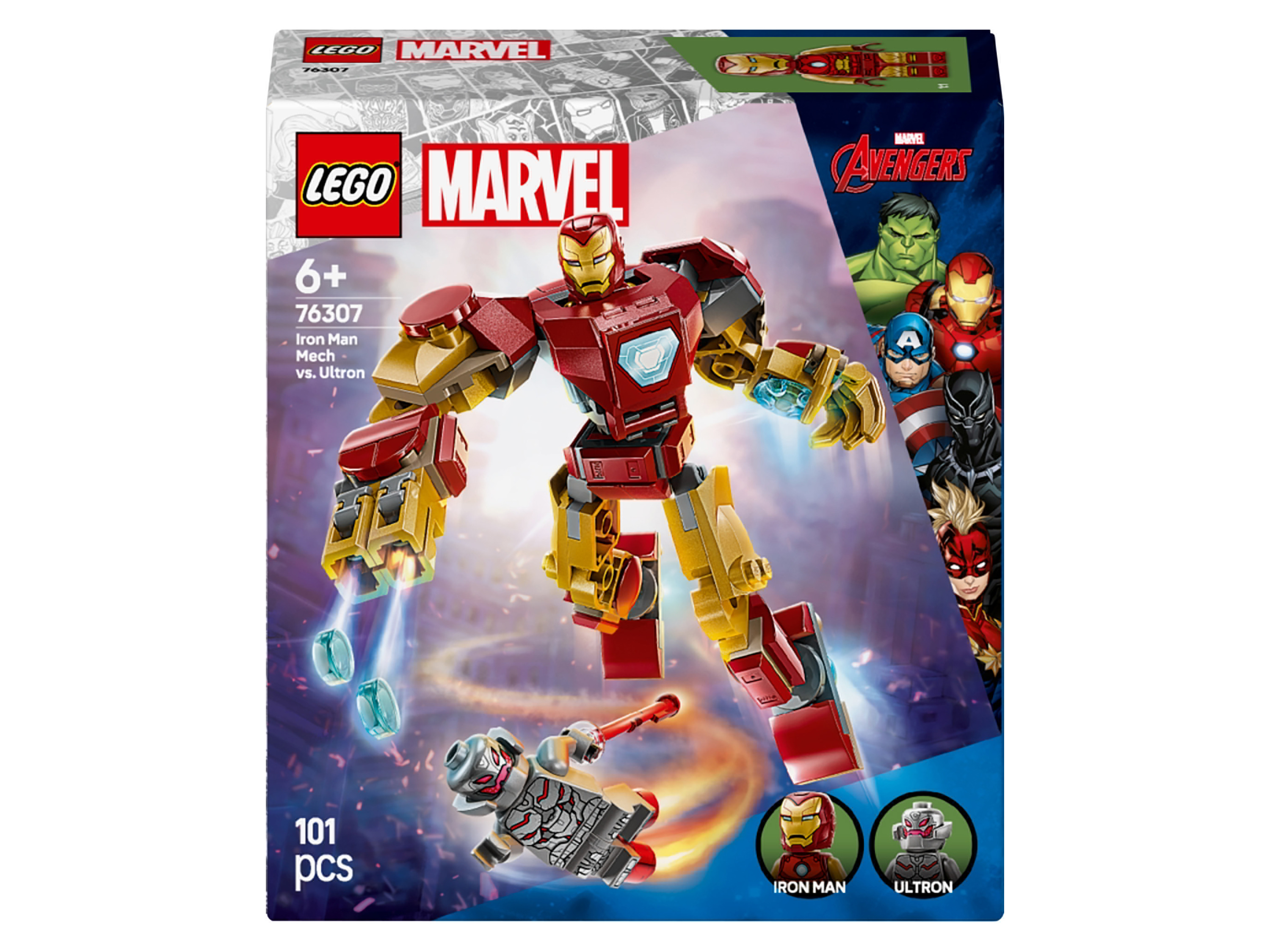 Lego® Marvel Super Heroes 76307 Iron Man v robotickém obleku vs. Ultron Iron Man v robotickém obleku vs. Ultron 76307 je stavebnice a hrací sada Lego® Marvel, která umožňuje aktivní hru dětem od 6 let, jež milují superhrdiny, dobrodružství a stavebnice. Tato sada Lego Marvel obsahuje kromě robota také 2 minifigurky: Iron Mana s otevírací helmou a otočnou hlavou se 2 různými výrazy obličeje a Ultrona s laserovým paprskem. Sestavitelný robot může pohybovat rukama, nohama i prsty. Po otevření horní části těla lze Iron Mana umístit do kokpitu pro minifigurku. Další digitální zábavu při stavění nabízí intuitivní aplikace Lego Builder, ve které mohou stavitelé zvětšovat a otáčet 3D modely a sledovat svůj postup. Charakteristika produktu tabletd Počet dílů: 101 Doporučený věk: pro děti od 6 let Potřeba baterií: ne Baterie součástí balení: ne Obsah balení: stavebnice skládající se z plně pohyblivého robota, 2 minifigurek a příslušenství Upozornění: Pozor! Nevhodné pro děti do 36 měsíců. Nebezpečí udušení. Malé díly. Lego, logo Lego, minifigurka, Duplo, logo Duplo, Bionicle, logo Bionicle, Legends OF Chima, logo Legends OF Chima, Dimensions, logo Dimensions, logo Friends, logo Minifigures, Mindstorms, logo Mindstorms Ev3, Mixels, logo Mixels, Ninjago, logo Ninjago, Nexo Knights a logo Nexo Knights jsou ochranné známky společnosti Lego Group a jsou zde použity se zvláštním svolením. ©2023 The Lego® Group.